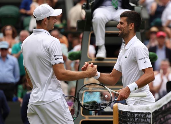 Con algo más de complicaciones de lo esperado, el serbio Novak Djokovic, en su partido número 100 en Wimbledon, venció al polaco Hubert Hurkacz (7-6 (6), 7-6 (6), 5-7 y 6-4 para meterse por décima cuarta ocasión en los Cuartos de Final del Grand Slam británico.