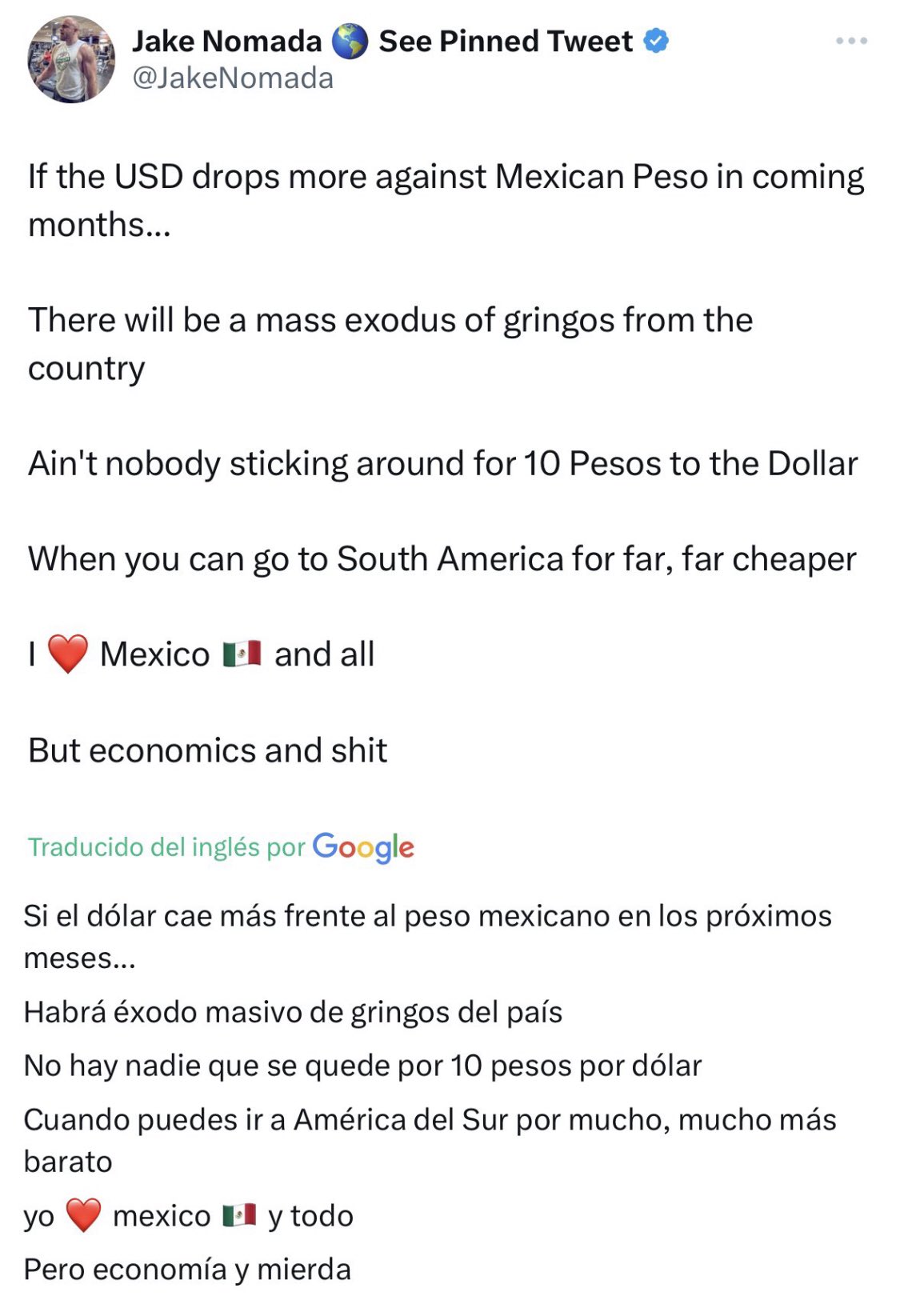 Jake factura en LATAM en dólares, lo que le permite obtener ganancias en moneda extranjera, mientras gasta en pesos mexicanos. Durante años, esta estrategia le ha sido favorable; no obstante, la constante apreciación del peso ha sido motivo de preocupación para él y otros extranjeros en su situación.