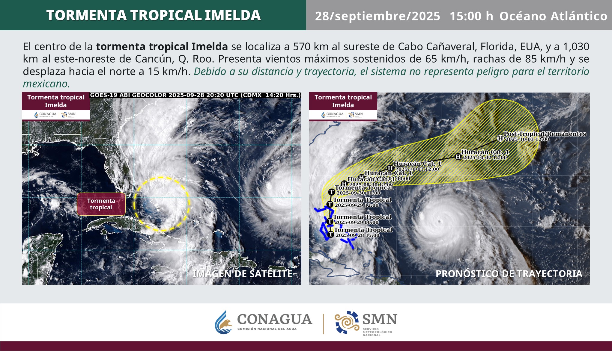 El centro de la tormenta tropical Imelda se localiza a 570 km al suroeste de Cabo Cañaveral, Florida, Estados Unidos y a 1,030 km al este-noreste de Cancún, Quintana Roo.