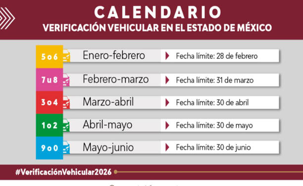 La Secretaría del Medio Ambiente y Desarrollo Sustentable del Edomex ha compartido el calendario oficial para este 2026 del trámite de la verificación vehicular, siendo estas las fechas fijadas: