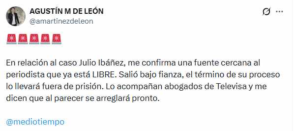 Agustín Martínez de León dio a conocer que una fuente cercana a Ibáñez le informó que el reportero salió bajo fianza y continuará su proceso en libertad; los abogados de Televisa trabajan en el caso y se espera que la situación se arregle lo más pronto posible.