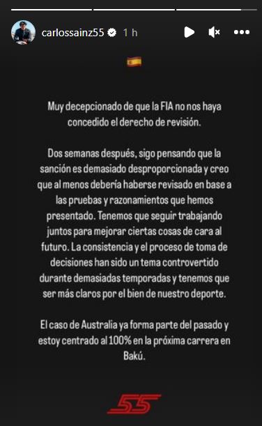 "Muy decepcionado de que la FIA no nos haya concedido el derecho de revisión. Dos semanas después, sigo pensando que la sanción es demasiado desproporcionada y creo que al menos debería haberse revisado en base a las pruebas y razonamientos que hemos presentado".