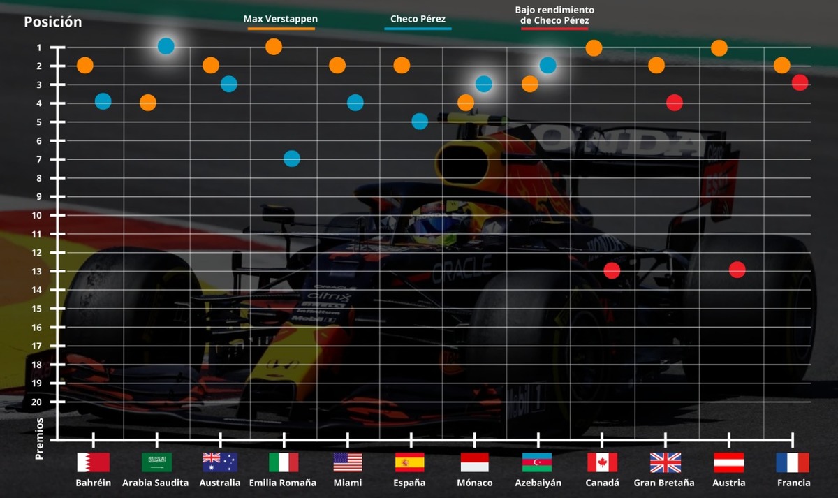 De estar a solo 21 puntos del líder Max Verstappen tras el Gran Premio de Azerbaiyán (150 puntos del neerlandés, por 129 del mexicano), la diferencia entre ambos ha aumentado en las últimas cuatro carreras hasta ser de 70 unidades (233/163), lo que ha estado ligado a la evolución de su monoplaza, hoy más acorde a las cualidades del actual campeón.