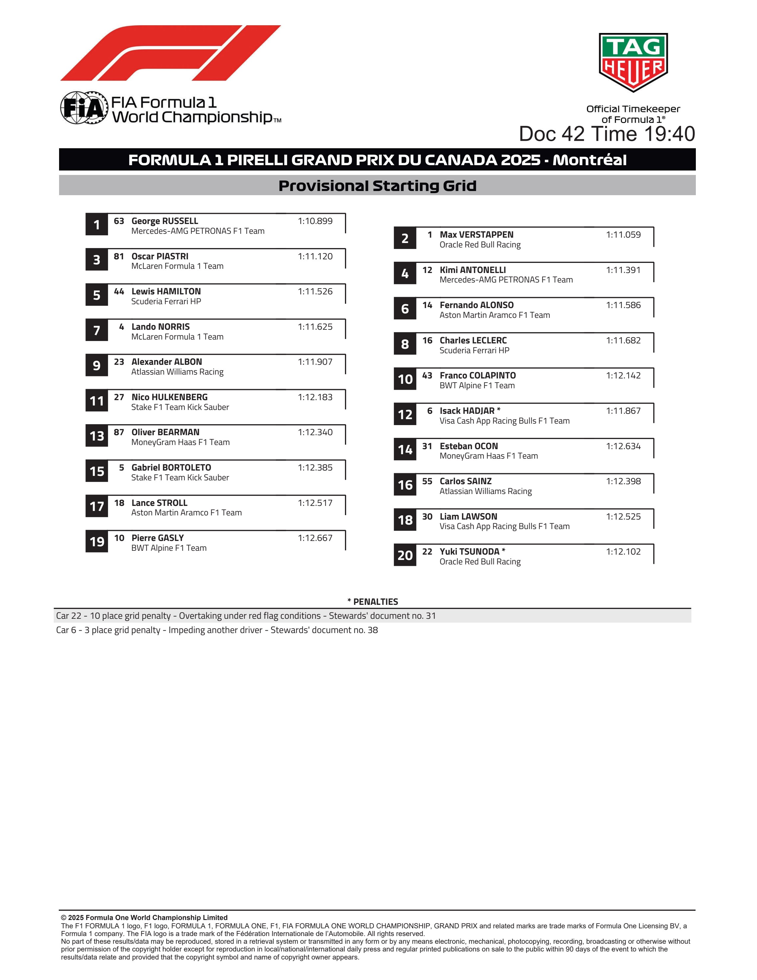 El francés Isack Hadjar (RB) fue sancionado con la pérdida de tres plazas en parrilla -por molestar al español Carlos Sainz (Williams) en la Q1- y, tras acabar noveno la calificación para el Gran Premio de Canadá, el décimo del Mundial de Fórmula Uno, arrancará duodécimo en el circuito Gilles Villeneuve de Montreal; donde, como consecuencia de su penalización, el argentino Franco Colapinto (Alpine) avanza otra plaza más y saldrá desde la décima.