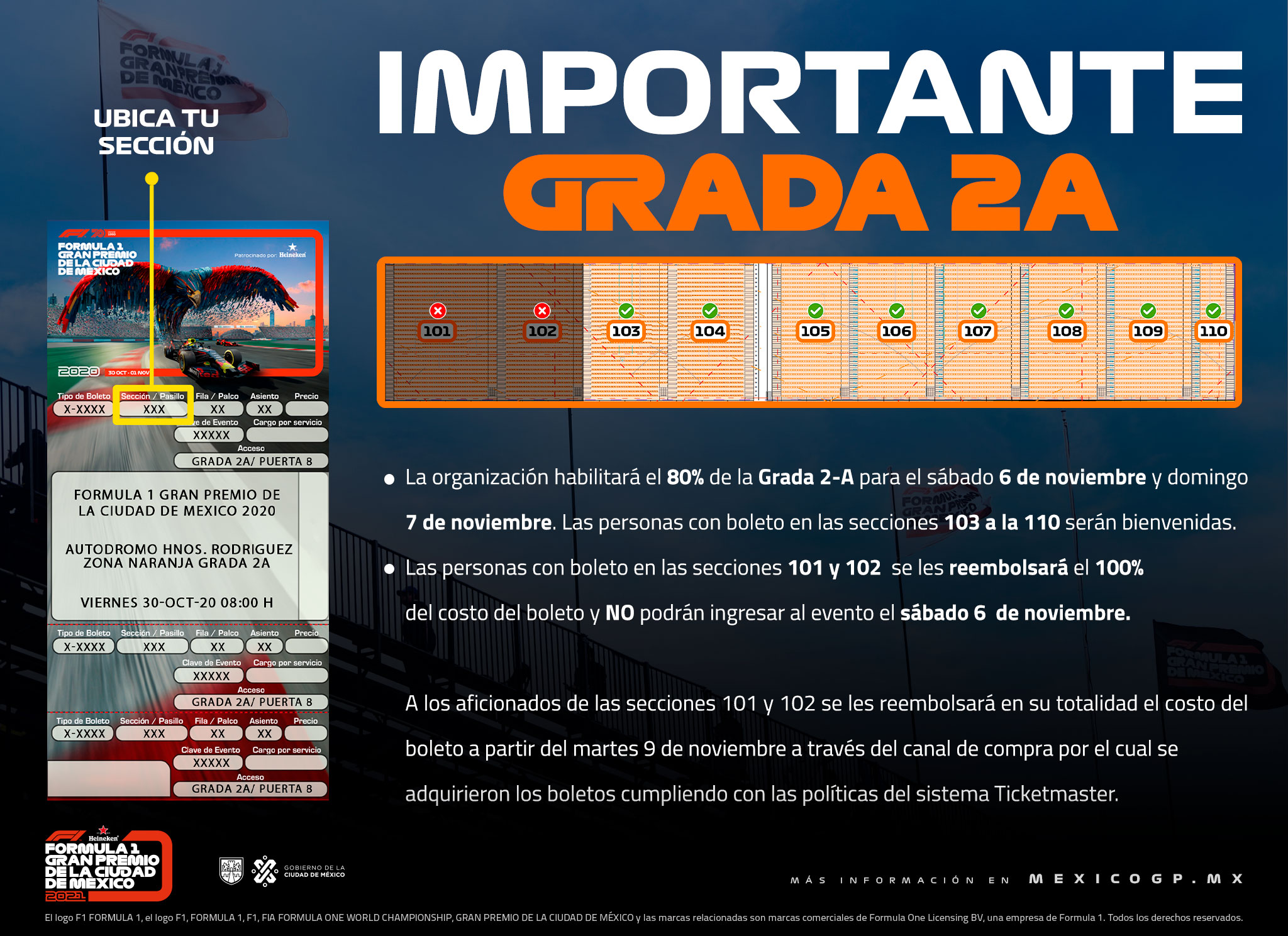 Es por eso que los organizadores han hecho el anuncio de la modificación de la Grada 2A del Autódromo Hermanos Rodríguez, pues un par de sectores de la misma no podrán ser utilizados y por lo tanto habrá reembolsos para los poseedores de boletos en dicha zona.