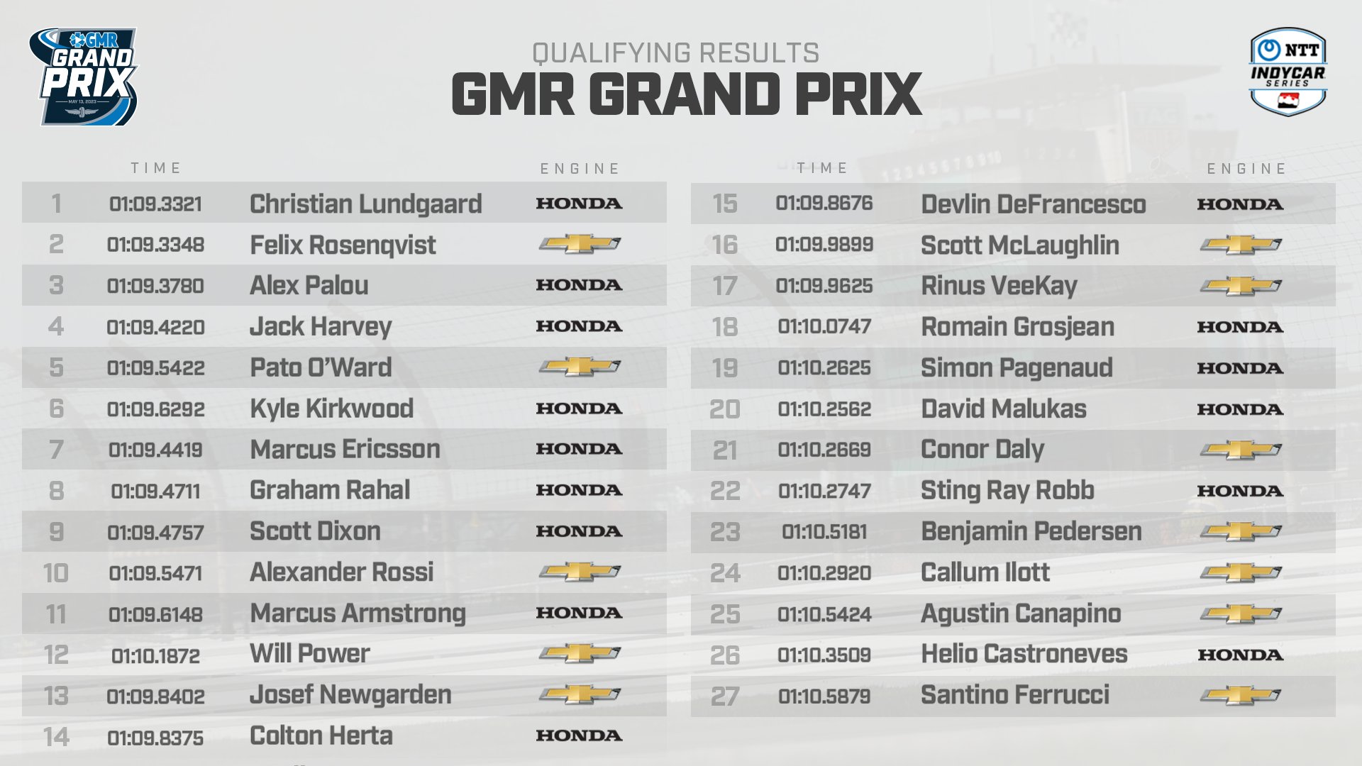 Por último, el argentino Agustín Canapino (Juncos Hollinger) y el brasileño Helio Castroneves (Meyer Shank) ocuparán la penúltima fila de la parrilla en el GMR Grand Prix solo por delante de Santino Ferrucci (A.J. Foyt), vigésimoséptimo en esta clasificación.