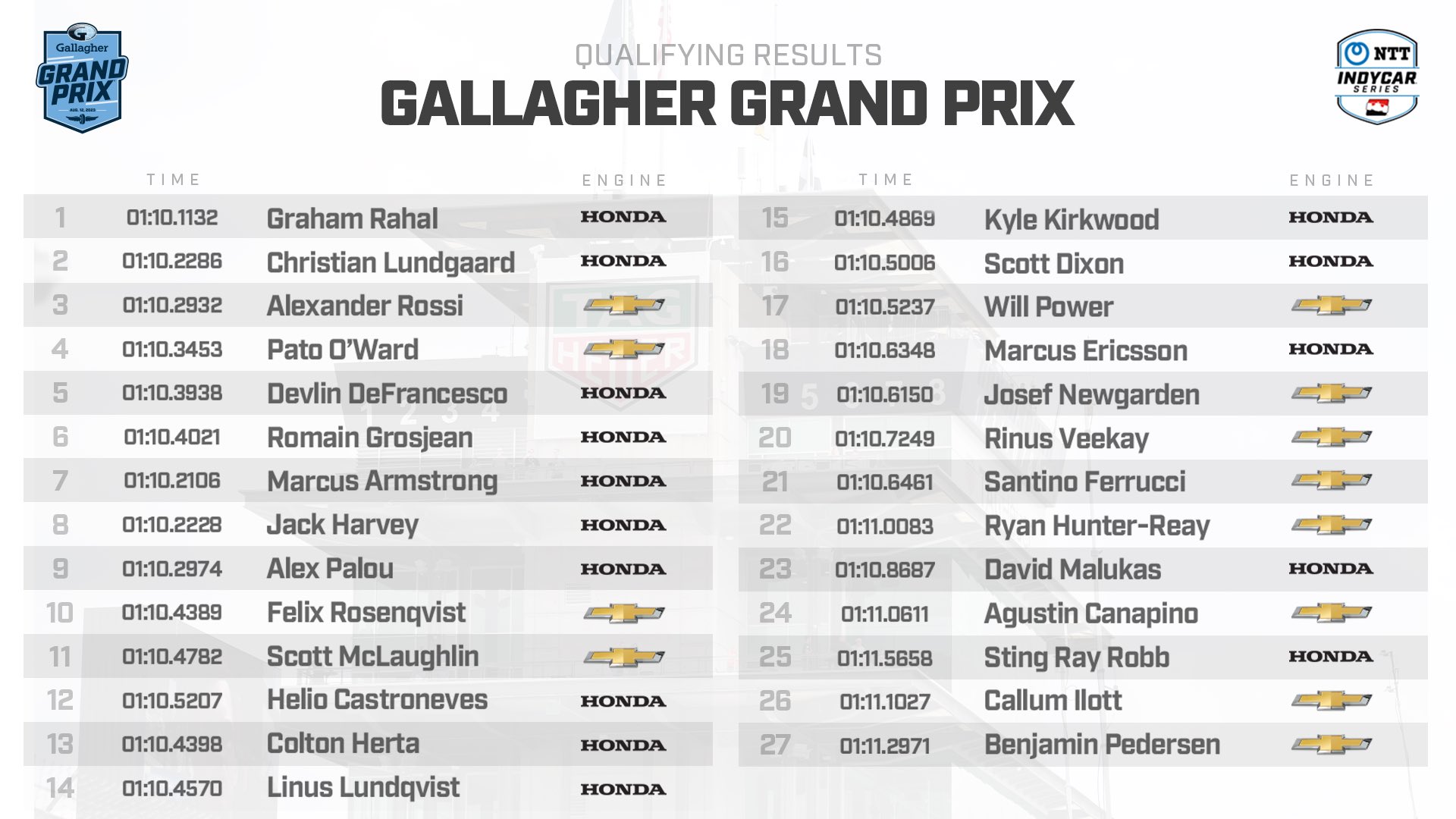 El estadounidense Graham Rahal (Rahal Letterman Lanigan) logró este viernes la pole para el Gran Premio de Gallagher de la IndyCar, una prueba en la que el mexicano Pato O'Ward (Arrow McLaren) saldrá cuarto y el español Álex Palou (Chip Ganassi), líder del campeonato, ocupará la octava posición de la parrilla.