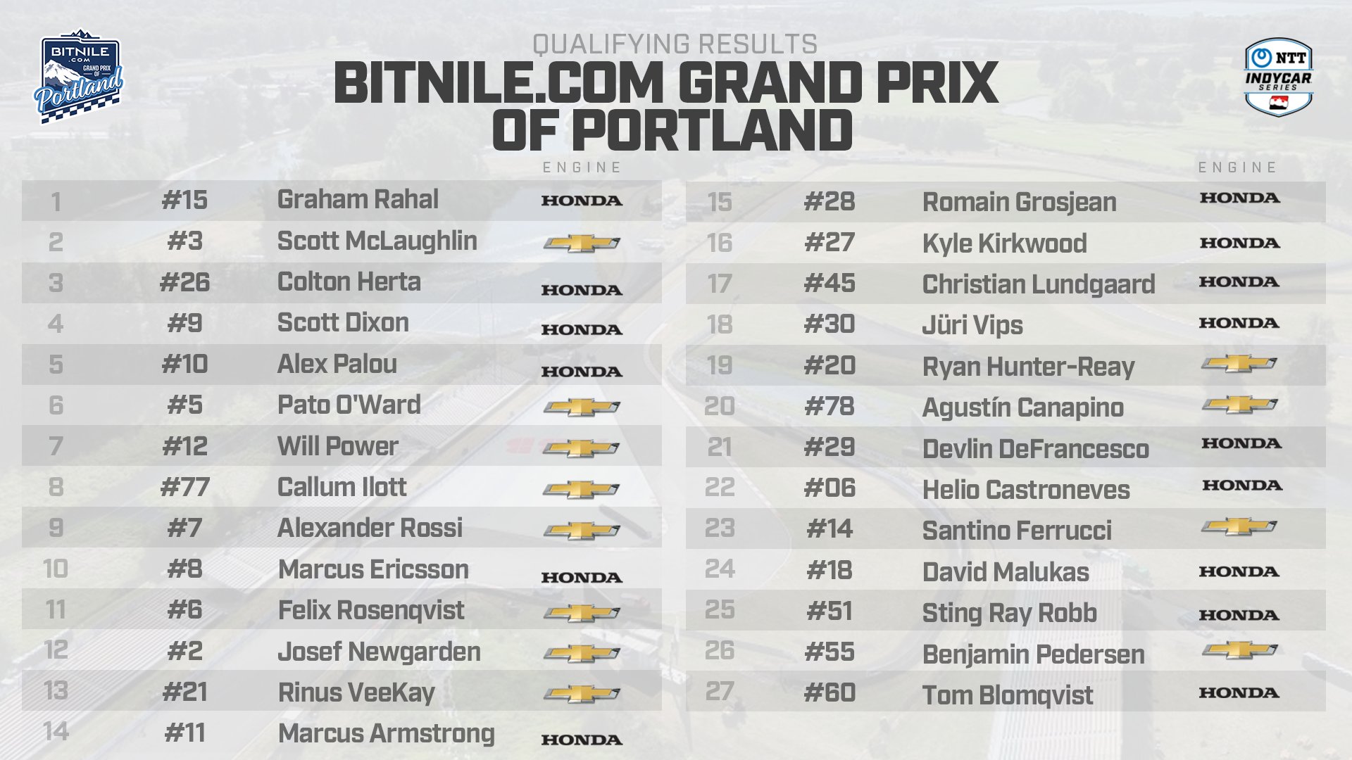 El estadounidense Graham Rahal (Rahal Letterman Lanigan Racing) logró este sábado la 'pole' para el Gran Premio de Portland de la IndyCar, que se disputa este domingo, mientras que el español Álex Palou (Chip Ganassi), que acaricia su segundo título, saldrá en la quinta posición.