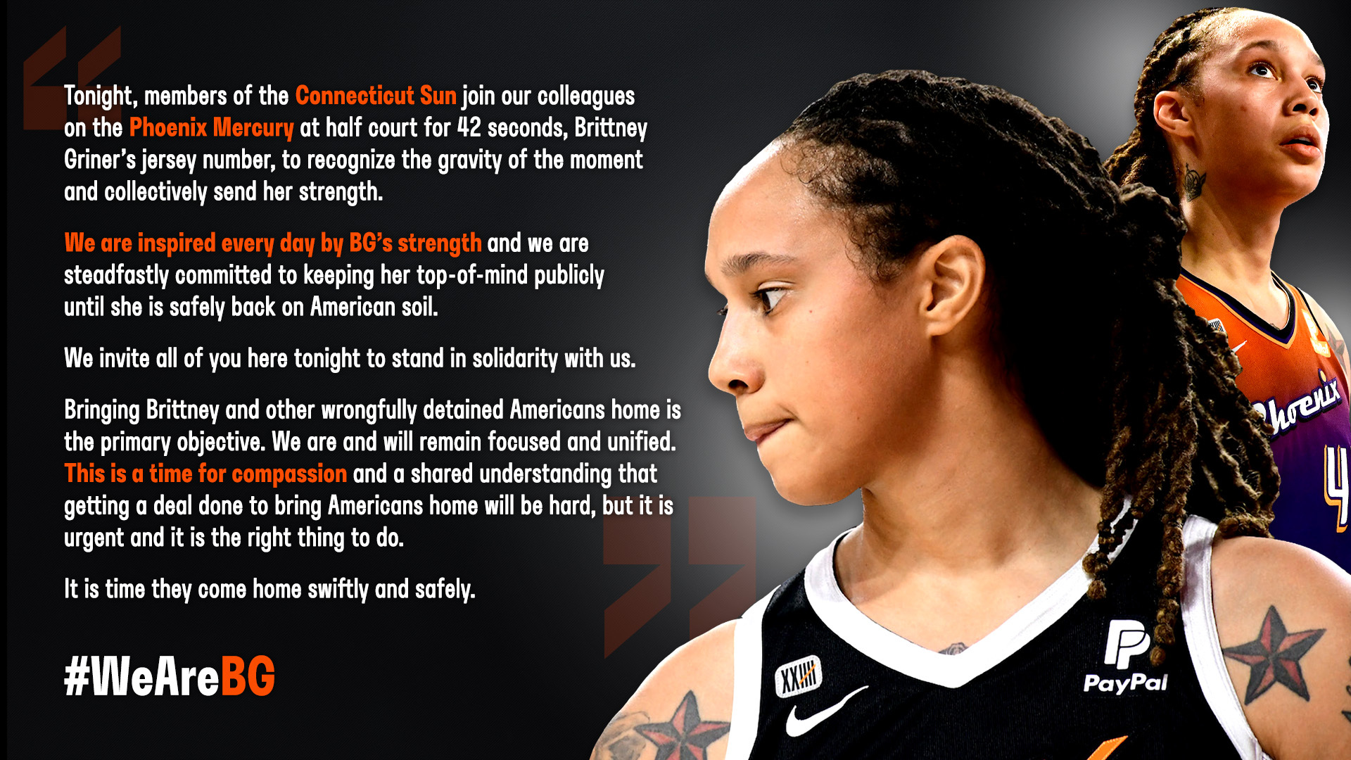 El período de tiempo (42) hizo honor a la camiseta de Griner, y el gesto hizo llorar a las jugadoras de ambos equipos y a los fanáticos en el Mohegan Sun Arena, en Uncasville, Connecticut, donde el momento terminó con cánticos de "¡Tráiganla a casa!".