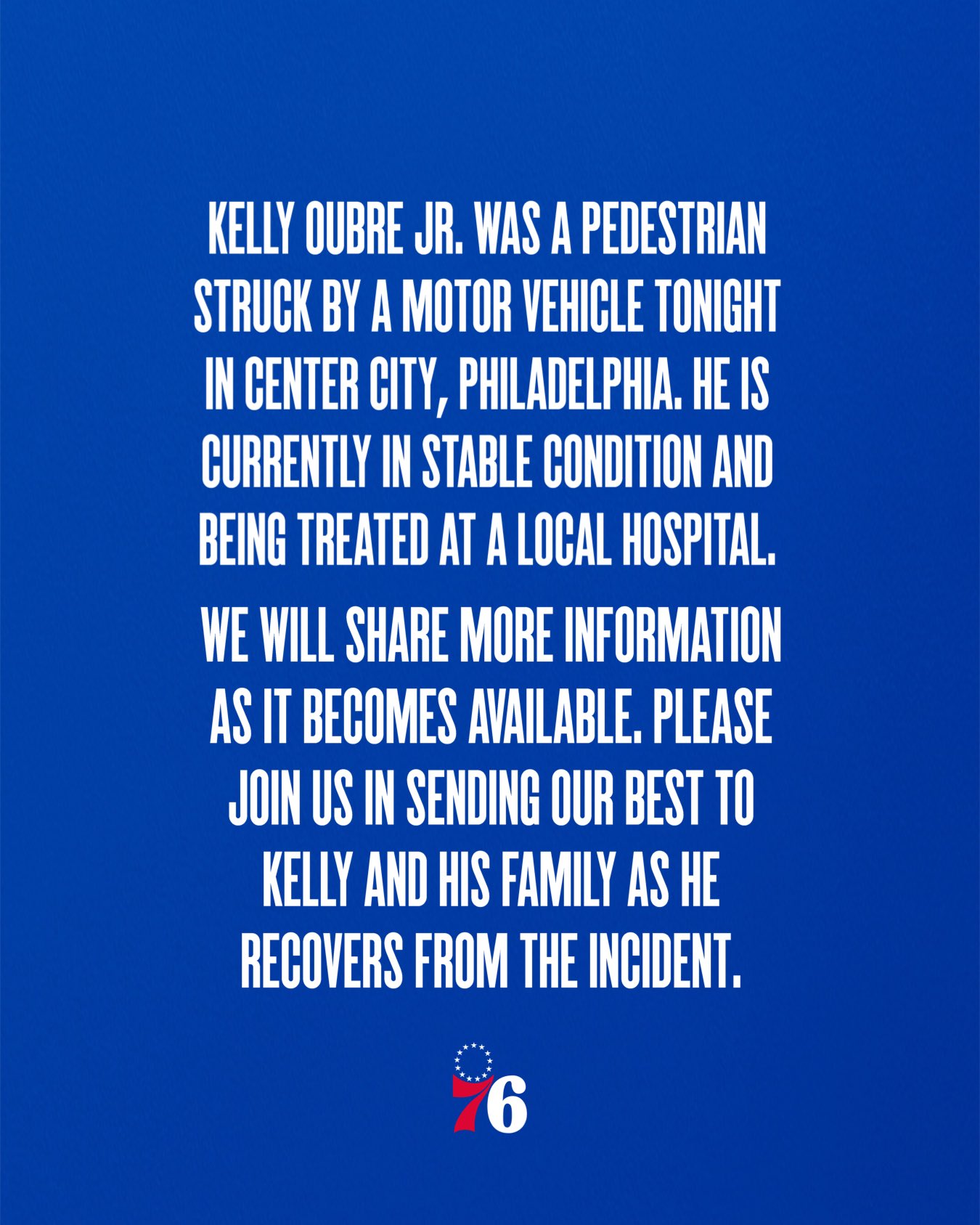 Kelly Oubre Jr., alero de los Philadelphia 76ers, fue hospitalizado en condición estable tras ser atropellado por un auto la noche del sábado, informó el equipo de la NBA.