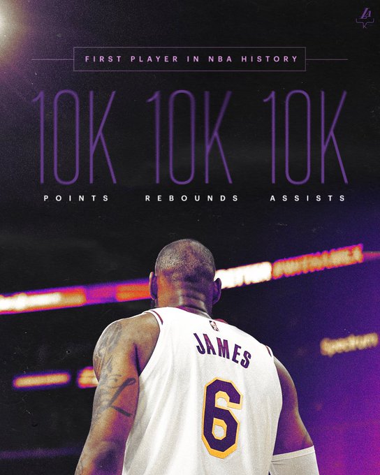 LeBron James superó este domingo, en el partido de Los Ángeles Lakers en casa de los Phoenix Suns, la barrera de las 10 mil asistencias y se convirtió en el único jugador en la historia de la NBA con más de 30 mil puntos, 10 mil rebotes, más las asistencias.