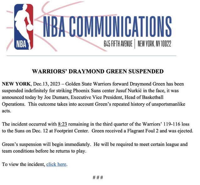 La NBA decretó este miércoles la suspensión "indefinida" de Draymond Green, una de las figuras de los Golden State Warriors, tras golpear el martes en la cabeza a Jusuf Nurkic (Phoenix Suns) y ser expulsado por tercera vez esta temporada.