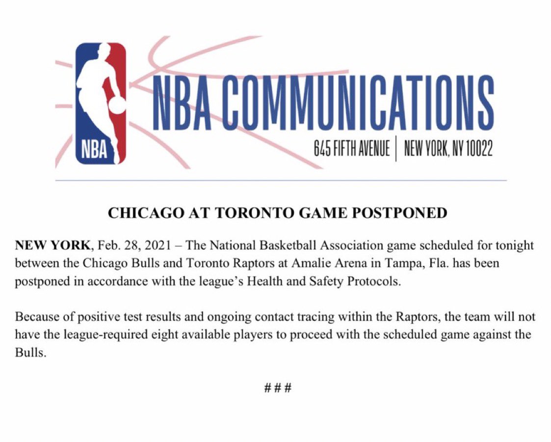 Los Raptors no cuentan con el mínimo de ocho jugadores disponibles para el choque debido a que algunos de sus miembros han dado positivo en pruebas de covid-19 o han sido apartados preventivamente por posible contacto con personas contagiadas, explicó la liga de basquetbol en un comunicado.