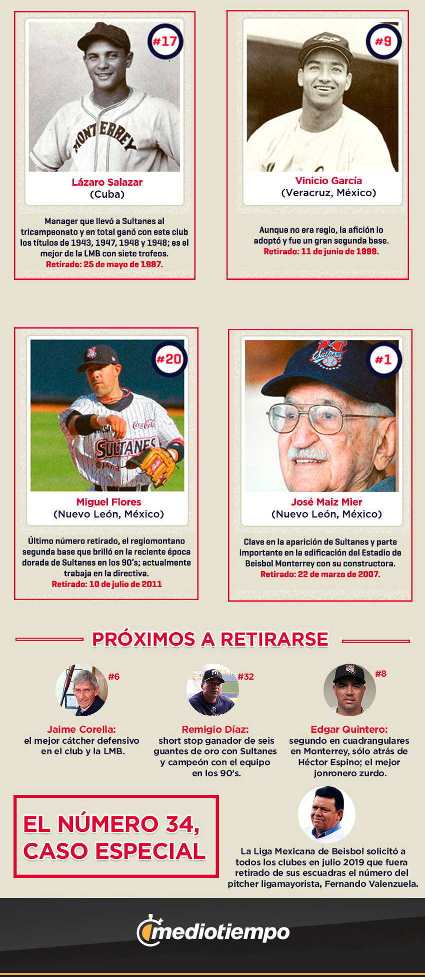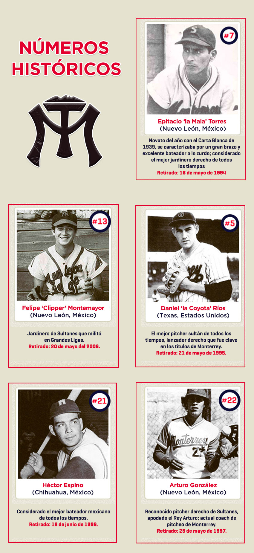 A lo largo de su historia Sultanes de Monterrey ha retirado nueve números de su franquicia. La más antigua en la Liga Mexicana que se ha mantenido sin salir del circuito, aunque ha cambiado de nombre iniciando como Carta Blanca, Industriales y Sultanes además de su apodo los Fantasmas Grises.