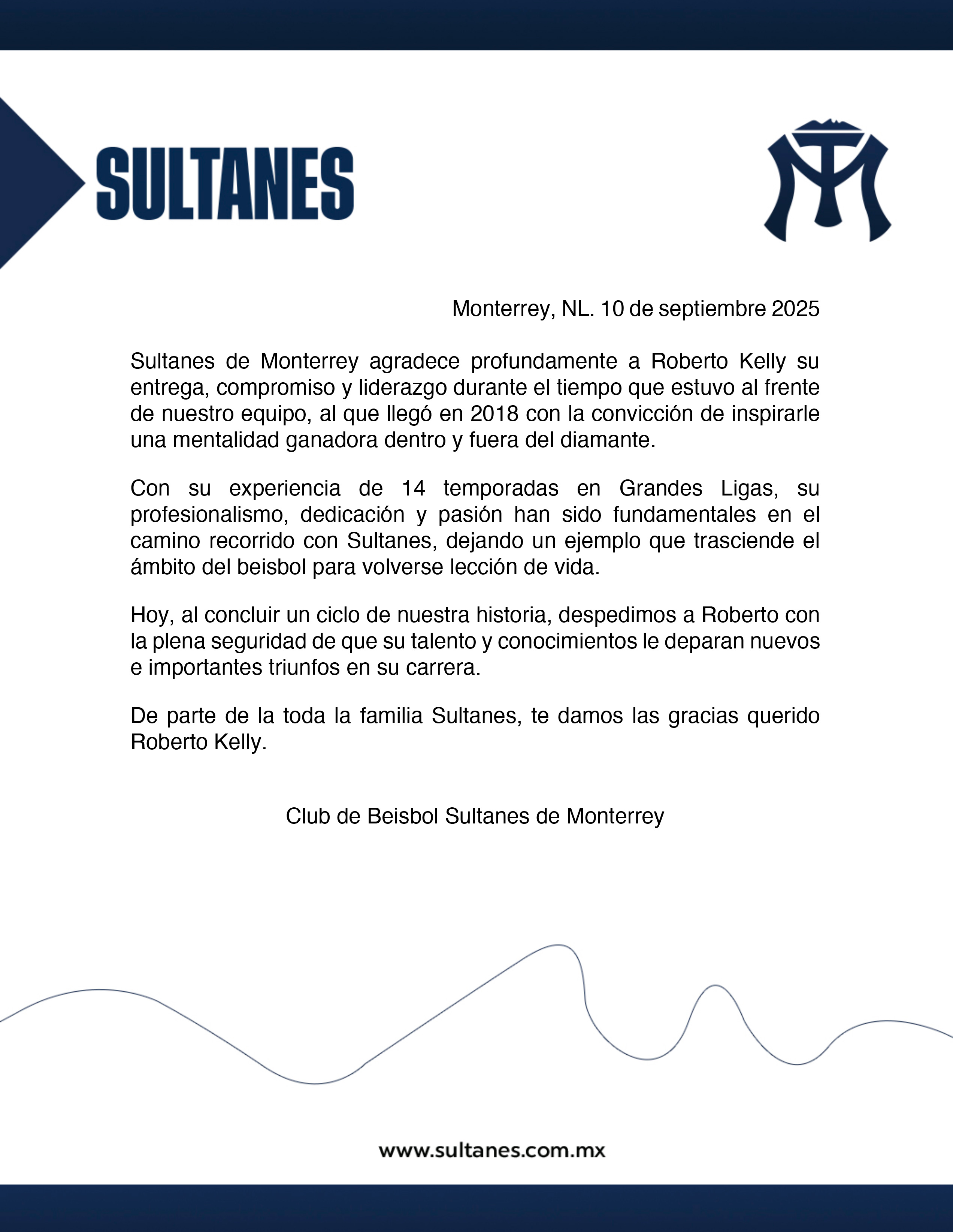 “Sultanes de Monterrey agradece profundamente a Roberto Kelly su entrega, compromiso y liderazgo durante el tiempo que estuvo al frente de nuestro equipo, al que llegó en 2018 con la convicción de inspirarle una mentalidad ganadora dentro y fuera del diamante”, señala el club.