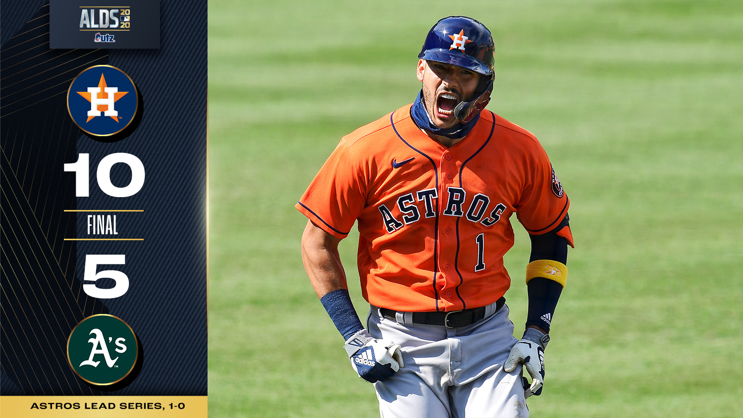 Con 16 imparables, incluidos jonrones de Alex Bregman y dos del puertorriqueño Carlos Correa, los Houston Astros vencieron este lunes 10x5 a los Oakland Athletics para irse arriba 1-0 en su Serie Divisional de la Liga Americana.