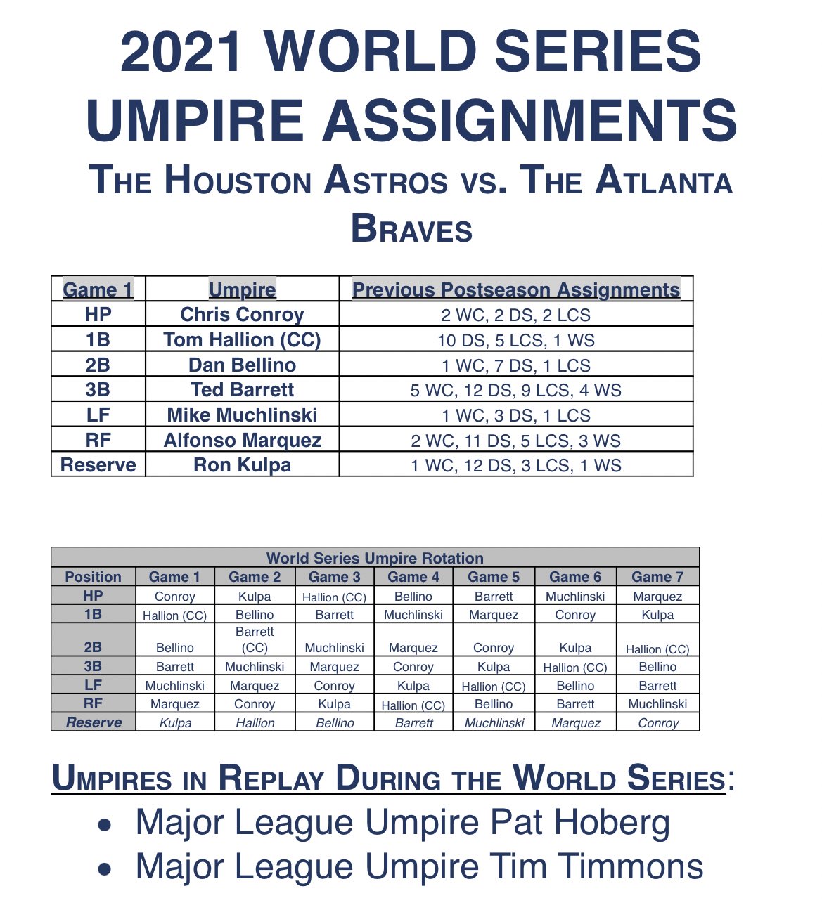 Alfonso Márquez estará en el Juego 1 entre Houston Astros y Atlanta Braves en el jardín derecho, para el segundo se moverá al jardín izquierdo y así hasta tener la posibilidad de ser el umpire de home en caso de un definitivo Juego 7 en el Minute Maid Park de Houston.