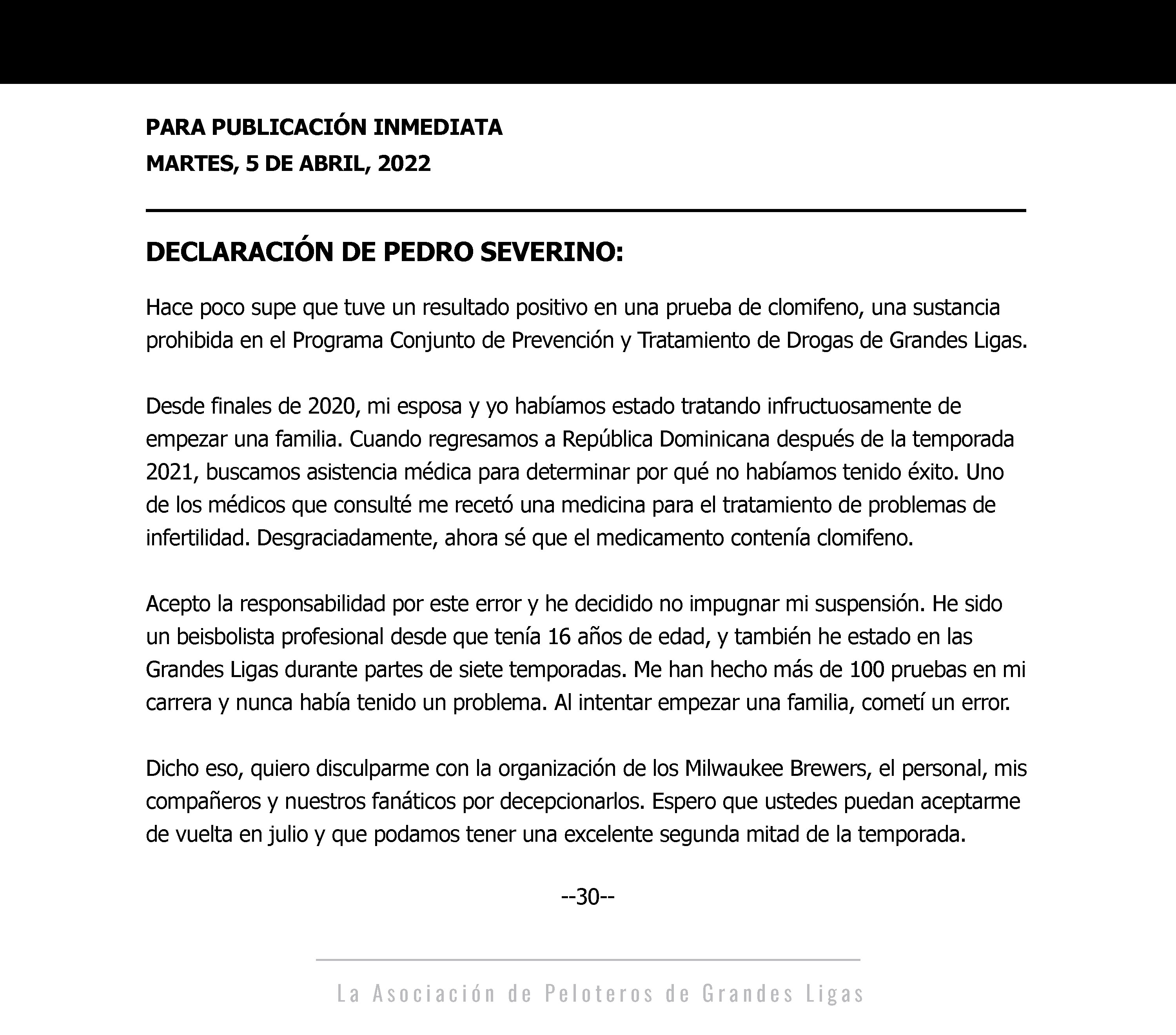 Severino se perderá cerca de la mitad de su salario de 1,9 millones de dólares. El jugador se disculpó con los Brewers, compañeros de equipo y los seguidores.