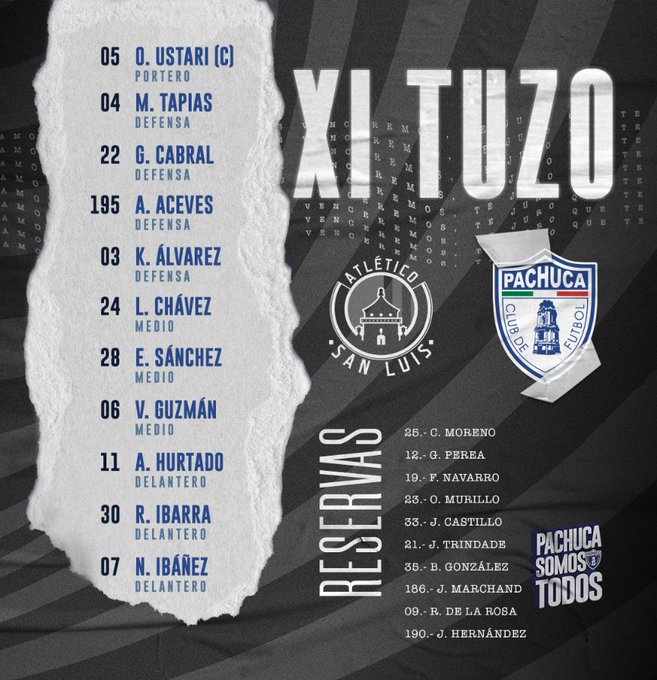 PACHUCA: Ustari, Álvarez, Tapias, Cabral, Aceves, Guzmán, Chávez, Ibarra, Ibáñez, Hurtado, Sánchez.