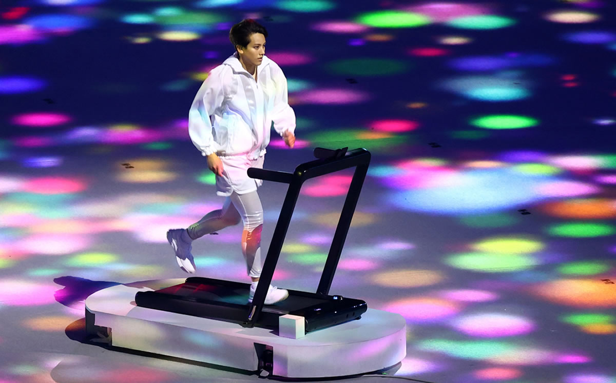 Un atleta aparece en el centro del campo sobre una caminadora y en seguida empiezan a mostrarse impresionantes detalles tecnológicos sobre la pista que cubre el césped. ¡Así arranca un evento que prmete mucho a pesar de todo!