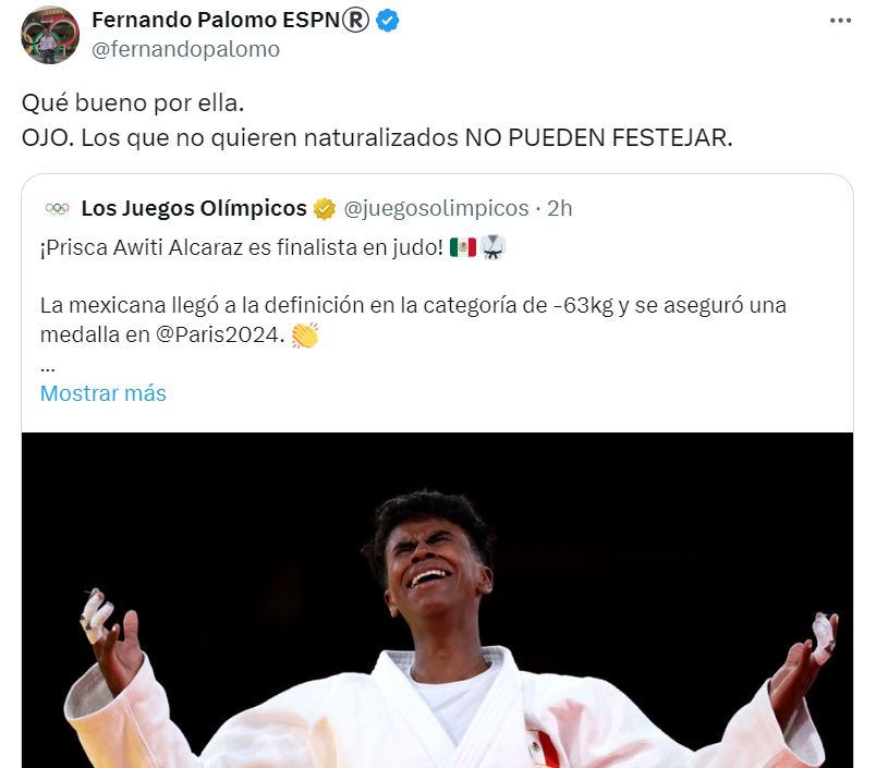 Dicha publicación generó cientos de reacciones en las que diferentes usuarios -y hasta analistas como Marc Crosas- tundieron a Palomo por decir que Awiti era naturalizada, lo cual no es así, pues pese a que nació en Londres y su padre es keniano, la judoca es mexicana por que su mamá también lo es.