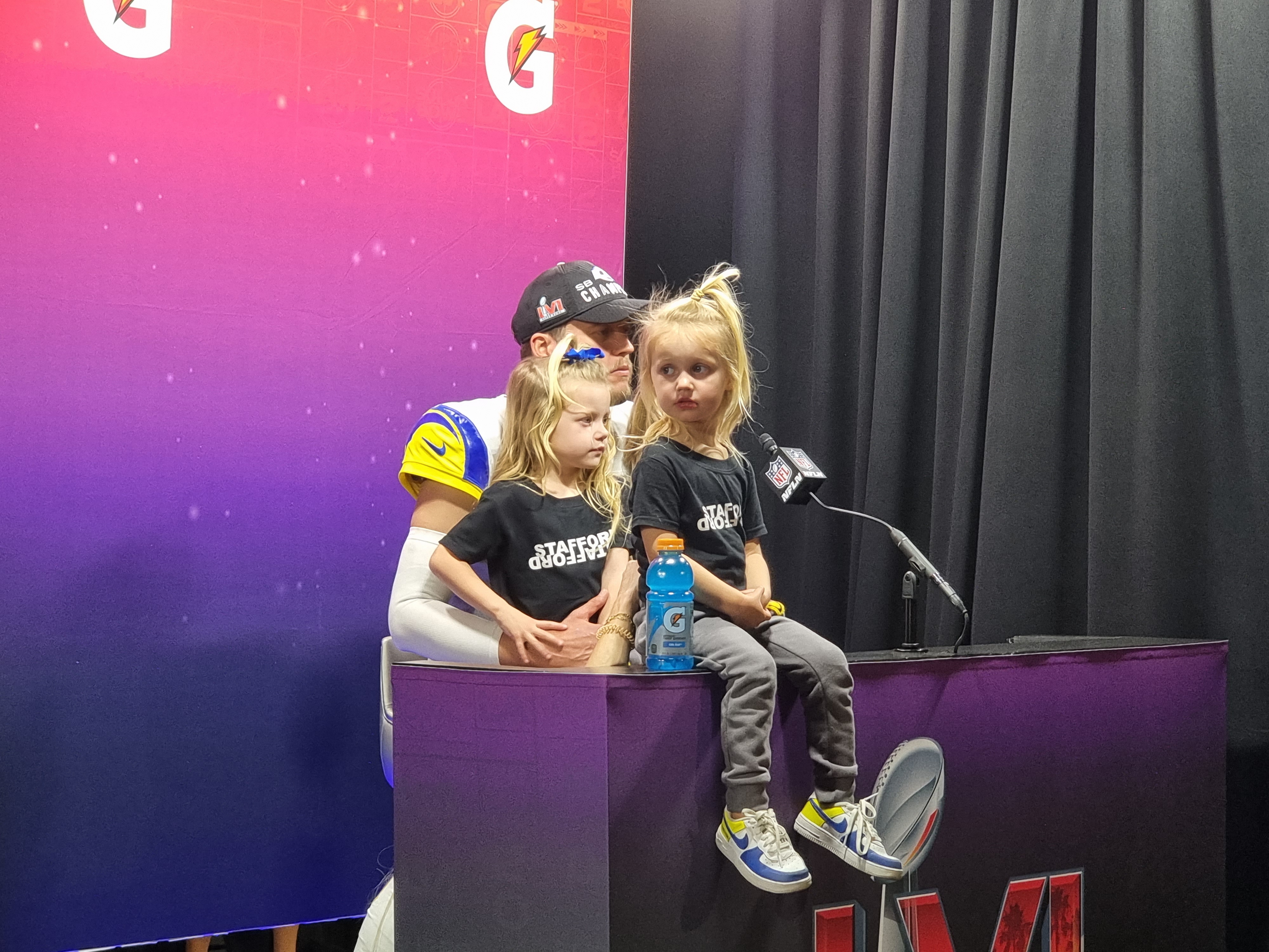 "Agradezco a la organización y al coach McVay porque confiaron ciegamente en mí, me querían aquí para ayudarlos a llegar a lo más alto y es gracias a todos ellos qué hoy puedo decirme campeón. Mis compañeros son lo máximo y me alegro especialmente por Aaron (Donald), es una inspiración", declaró el quarterback, cuyas tres hijas se robaron las miradas ante las lentes de la prensa en las entrevistas posteriores, acompañando a su padre en el estrado.