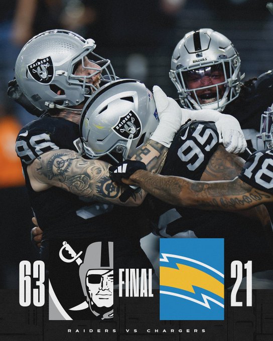 Las Vegas Raiders machacaron la noche del jueves por 63-21 a Los Angeles Chargers, anotando la tercera mayor cantidad de puntos en un juego de temporada regular de la NFL.