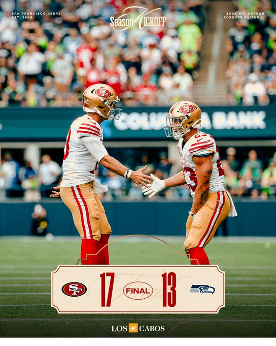 Los San Francisco 49ers, con más de un apuro, logró sacar la victoria 17-13 sobre los Seattle Seahawks en el debut de ambos en la temporada 2025-2026 de la NFL.
