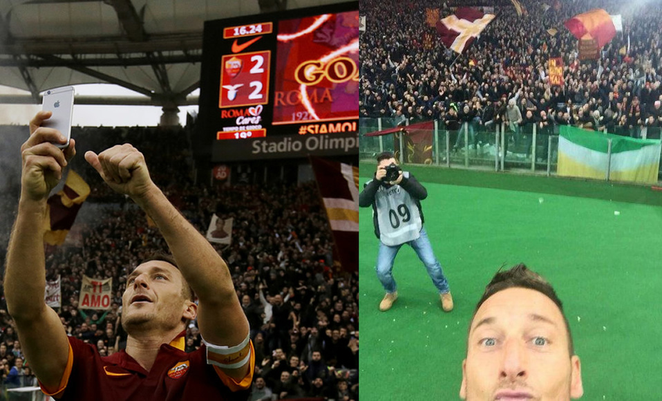 En enero de 2015, fue Francesco Totti quien innovó esta manera de festejar, al anotar el gol del empate de la Roma ante la Lazio y tomar su celular para sacar una selfie con los "tifosis" de fondo en plena celebración. Aunque el eterno capitán de La Loba no la publicó de inmediato, sino un par de horas después.