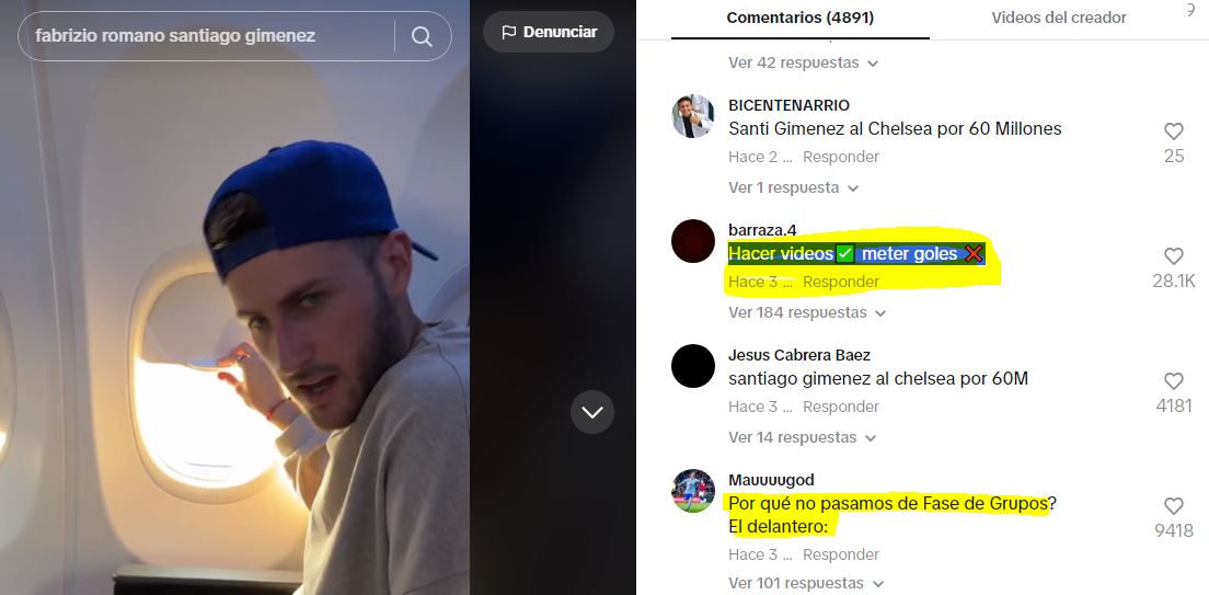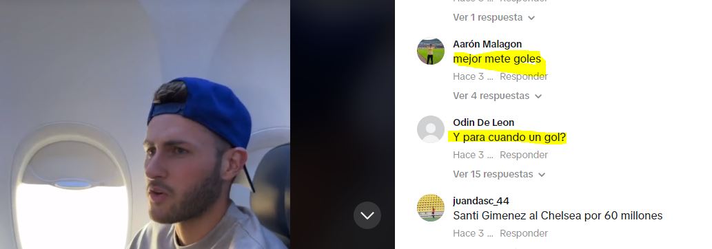 "Mejor mete goles"; "¿Y para cuándo un gol?"; "Así fuera bueno para meter goles"; "¿por qué no metes goles en la selección mejor?"; "ponte a meter goles"; "Para eso si eres bueno Santi, pero para meter goles", fueron algunos de los comentarios que se pueden leer en la publicación de TikTok.