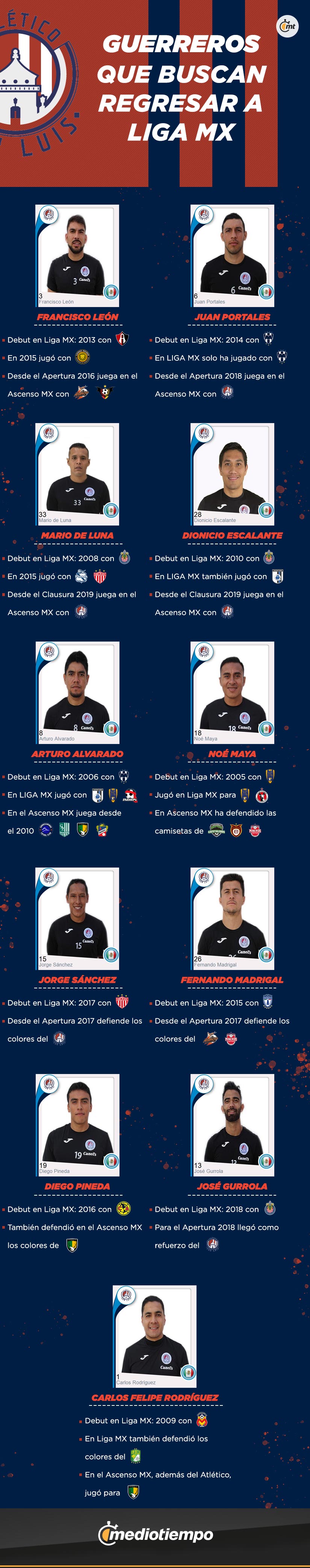 De los 28 jugadores que tiene registrados el Atlético San Luis en su plantilla, 11 ya probaron las mieles de jugar en la Liga MX, división a la que intentarán regresar este semestre, tras haber conseguido el Campeonato del Ascenso MX en el Apertura 2018 y de liderar ampliamente la Fase Regular del Clausura 2019.