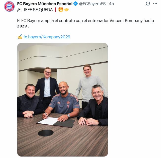 Según indicó el club de la Bundesliga en un comunicado, Kompany, que llegó al equipo bávaro en la campaña 2024-2025 con un contrato válido inicialmente hasta el verano de 2027, será el director técnico del club hasta el 30 de junio de 2029.