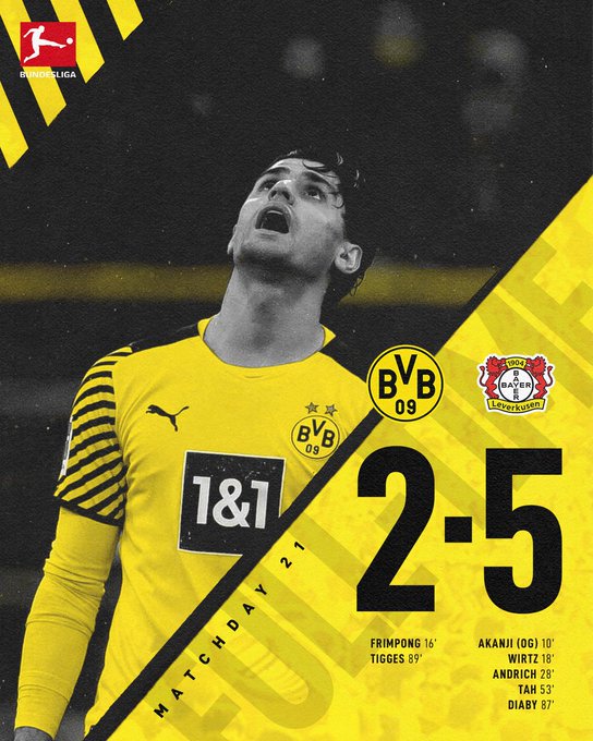 En la segunda parte, un Borussia Dortmund decaído vio cómo el rival Jonathan Tah marcaba el cuarto mediante una gran volea tras un saque de esquina (53') y el francés Moussa Diaby (87') puso el quinto tras un disparo con la izquierda colando el esférico por el lado derecho de los tres palos, tras una pase de Frimpong.