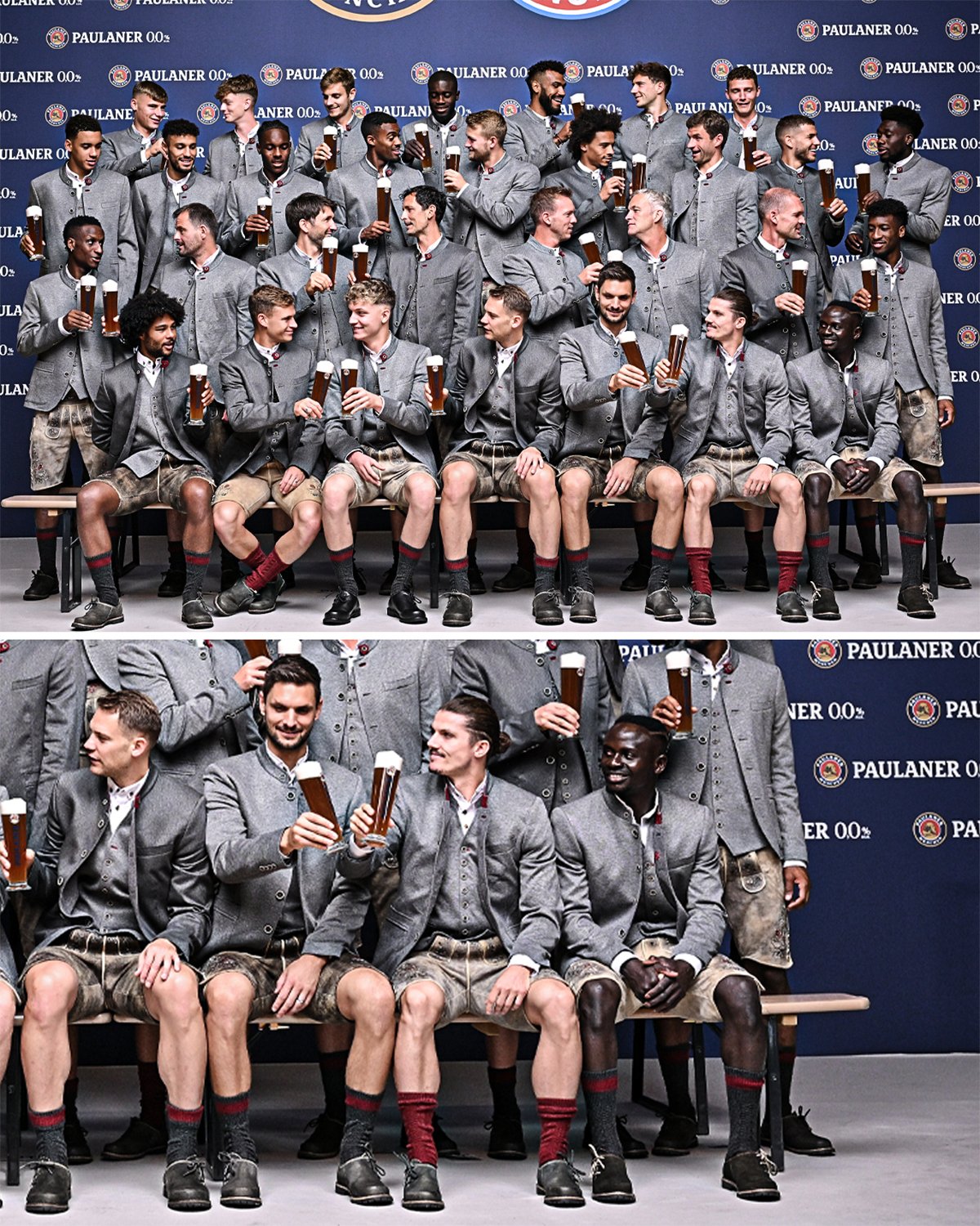 Los futbolistas y cuerpo técnico se vistieron con el típico traje bávaro. Hasta ahí sin problemas, pero Sadio Mané se negó a siquiera tocar una cerveza como marca la tradición de los germanos, que suelen aparecer con yarda en mano para la fotografía.