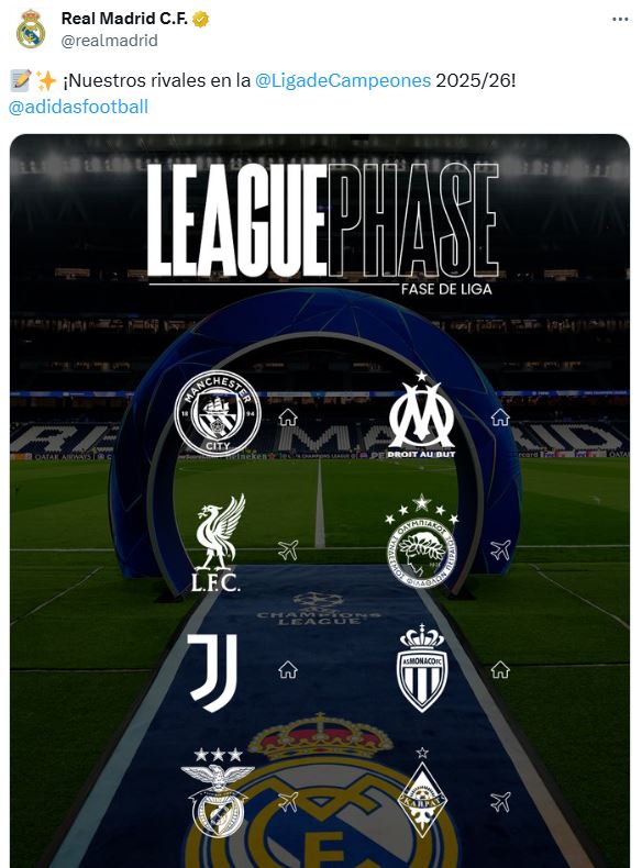 Este jueves se realizó en Mónaco el esperado sorteo de la Fase de Liga de la Temporada 2025-26 de la UEFA Champions League, mismo en donde el Real Madrid —equipo que año tras año es uno de los grandes favoritos para conseguir el título— conoció el camino que tendrá que afrontar rumbo a los Octavos de Final.
