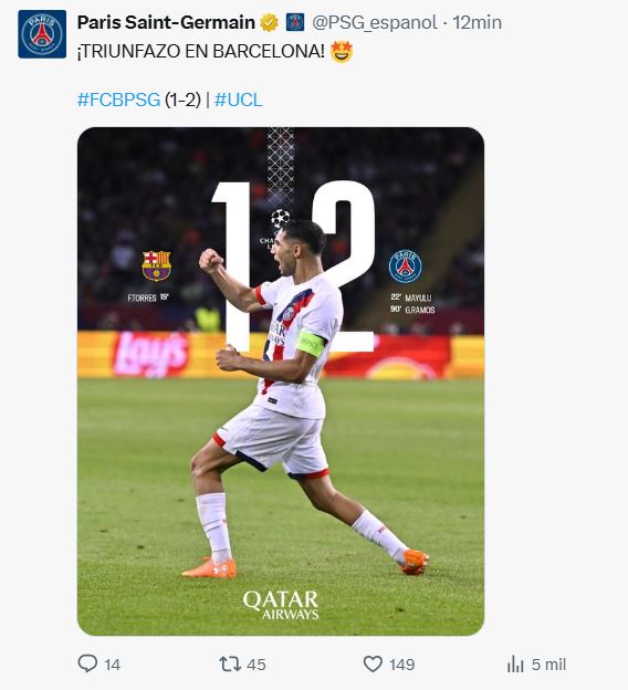 Con esta victoria, el PSG, vigente campeón, se suma al grupo que encabeza la clasificación con un pleno de seis puntos, mientras que el conjunto catalán cae a la decimosexta posición, con 3 unidades.