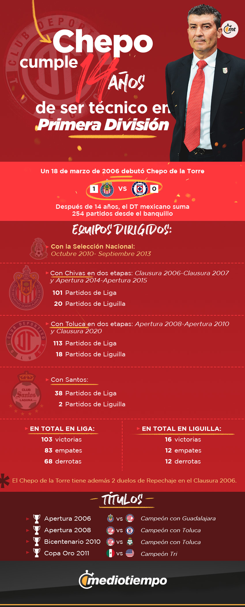 Un 18 marzo de 2006 José Manuel 'Chepo' de la Torre debutó en el banquilo en un Chivas-Cruz Azul. Después de 14 años, el DT mexicano suma más de 250 partidos dirigidos en Primera División.