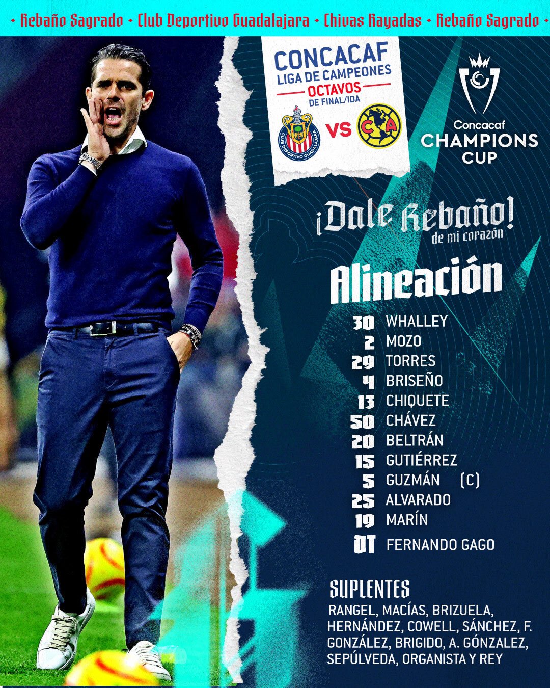 Chivas va con Óscar Whalley en la portería. Alan Mozo, Antonio Briseño, Jesús Gilberto Orozco y Mateo García en la zaga. Fernando Beltrán, Víctor Guzmán y Erick Gutiérrez en medio campo. Arriba Roberto Alvarado, Eduardo Torres y Ricardo Marín.