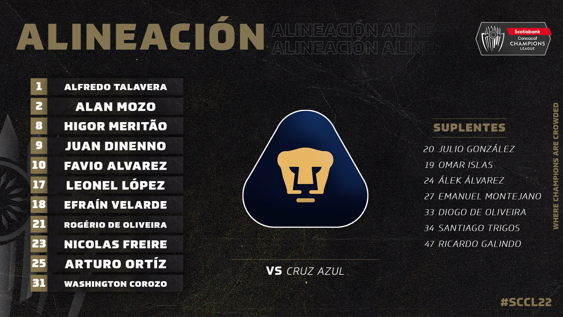 Por Pumas arrancará en el arco Alfredo Talavera, custodiado por Alan Mozo, Arturo Ortiz, Nicolás Freire y Efraín Velarde; la media cancha será ocupada por Leonel López, Favio Álvarez e Higor Meritao, mientras que el ataque tendrá a Washington Corozo, José Rogerio y Juan Ignacio Dinenno.