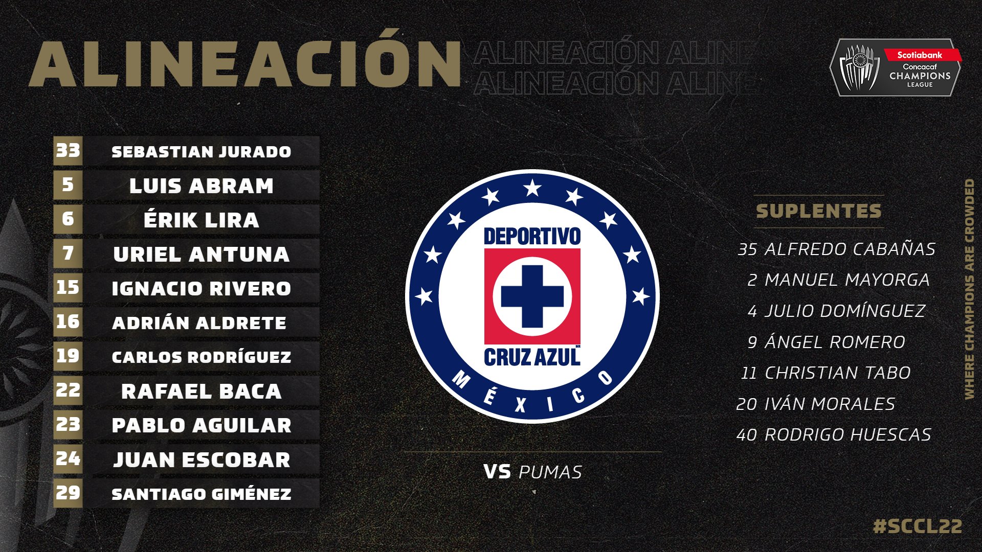Por la Máquina Celeste se pondrá los guantes Sebastián Jurado ante la ausencia de Jesús Corona; en la zaga aparecerán Juan Escobar, Luis Abram, Pablo Aguilar y Adrián Aldrete; el mediocampo poblado por Rafael Baca, Erik Lira, Ignacio Rivero y Carlos Rodríguez, dejando el frente libre para Uriel Antuna y Santiago Giménez.