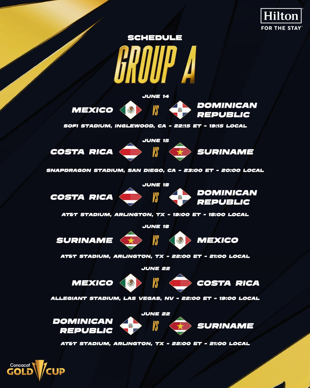 Después de enfrentar a Surinam, Costa Rica, subcampeón en la edición de 2002, jugará ante República Dominicana el 18 de junio y cerrará la fase de grupos ante México el 22 de junio.