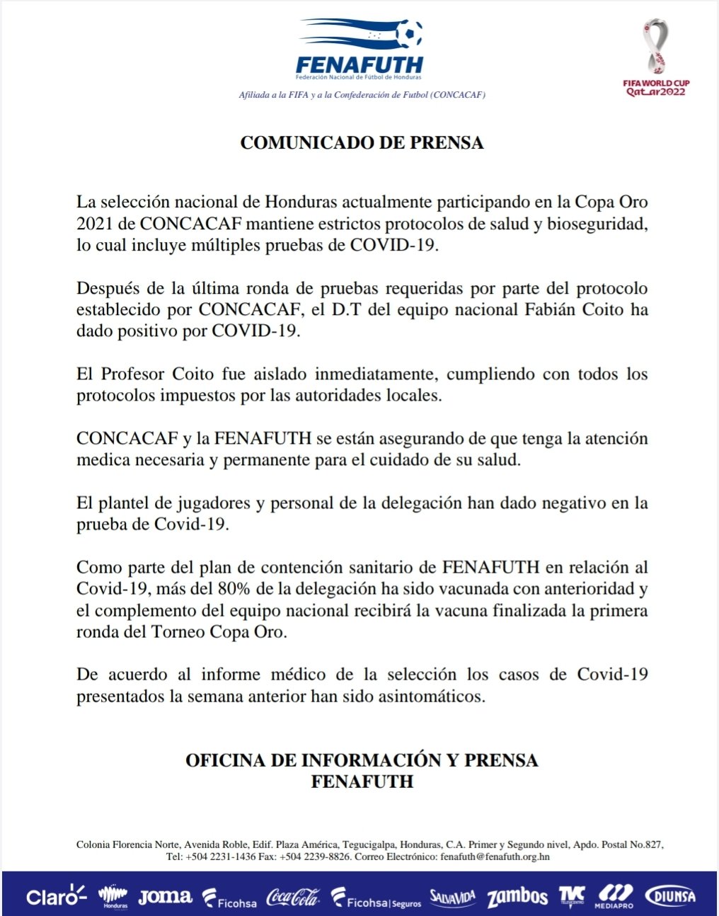 "Después de la última ronda de pruebas requeridas por parte del protocolo establecido por Concacaf, el director técnico del equipo nacional Fabián Coito ha dado positivo por COVID-19. El profesor fue aislado inmediatamente, cumpliendo con todos los protocolos impuestos por las autoridades locales", informó la Federación Nacional de Futbol de Honduras (FENAFUTH).