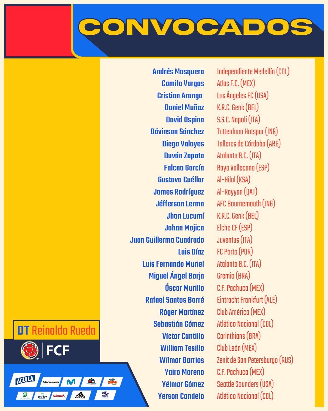 En la lista de convocados también se destaca el llamado del delantero Cristian Arango de Los Ángeles FC de Estados Unidos, del arquero Andrés Mosquera del Independiente Medellín, del defensa Yéimar Gómez del Seattle Sounders de la liga estadounidense y del atacante Diego Valoyes del club argentino Talleres de Córdoba.