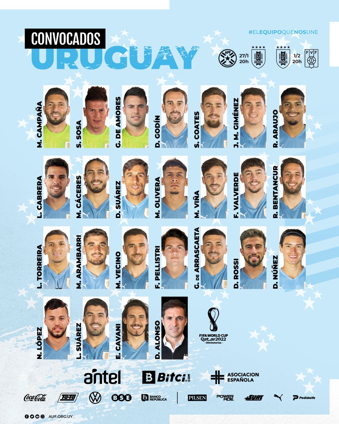 - Defensas: Diego Godín, Sebastián Coates, José María Giménez, Ronald Araújo, Leandro Cabrera, Damián Suárez y Mathías Olivera.