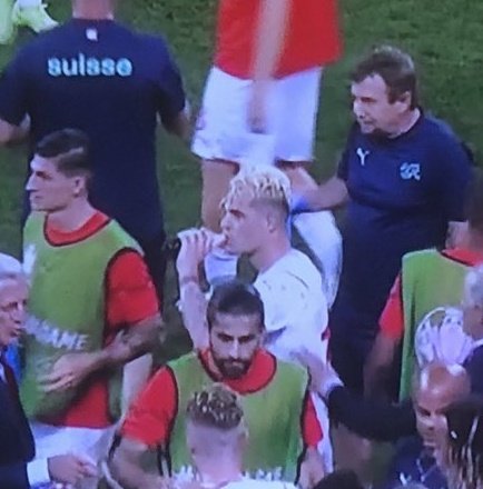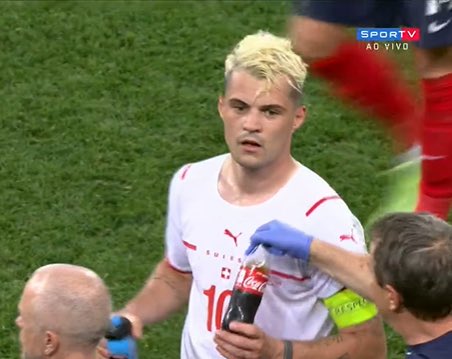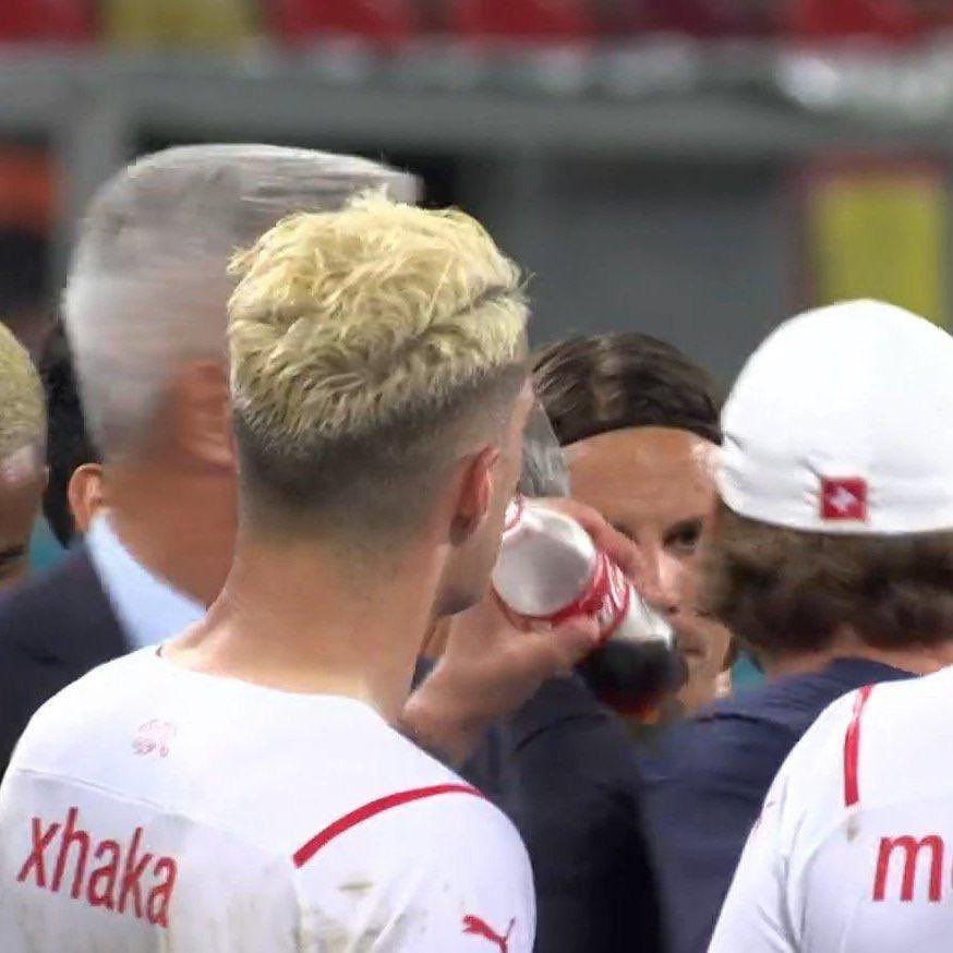 Granit Xhaka, jugador helvético, fue visto bebiendo una gaseosa momentos antes de la tanda de penales del duelo de Octavos de Final de la Euro entre Francia y Suiza.