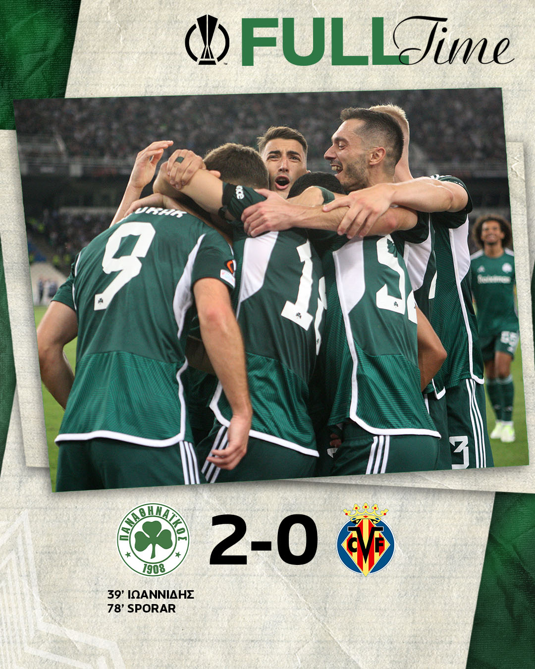 Fotis Ioannidis (minuto 38), elevando ante Pepe Reina tras recibir de Giannis Kotsiras, y el esloveno Andraz Sporar (78) con un disparo raso firmaron los goles del 'Pana', que no se pone líder del grupo ya que el Rennes francés consiguió un triunfo ligeramente más amplio (3-0) sobre el Maccabi Haifa israelí, también este jueves.
