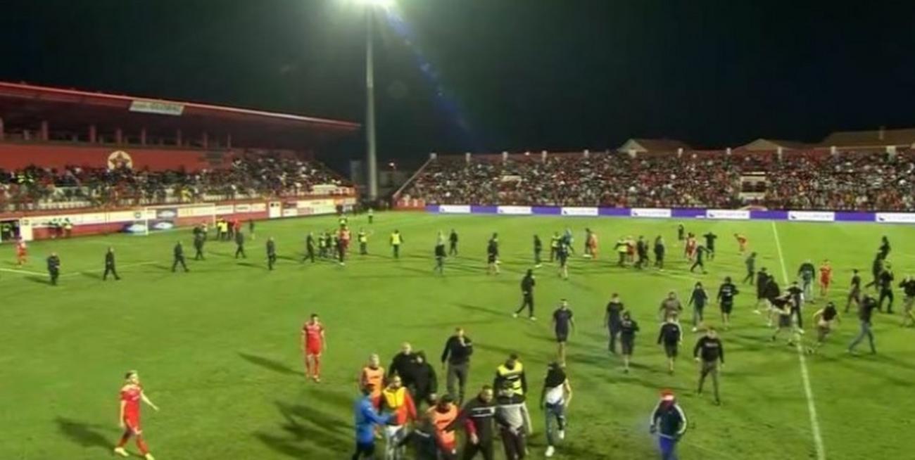 Aficionados del Velez descendieron al césped en el minuto 82 del partido, tras un segundo gol que aseguraba la victoria (2-0) del Borac, actual campeón, y después de haber protestado varias decisiones del árbitro.