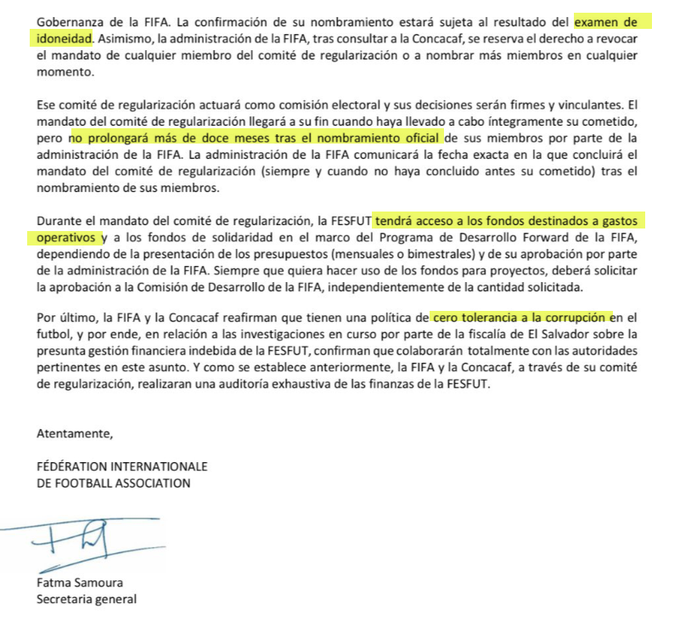 Las nuevas autoridades deben "revisar exhaustivamente los estatutos de la Fesfut (y otra reglamentación si fuera necesario) y garantizar que cumplan plenamente con los requisitos contenidos en los estatutos de la FIFA y Concacaf antes de someterlos a la aprobación del Congreso de la Fesfut", precisa la FIFA.