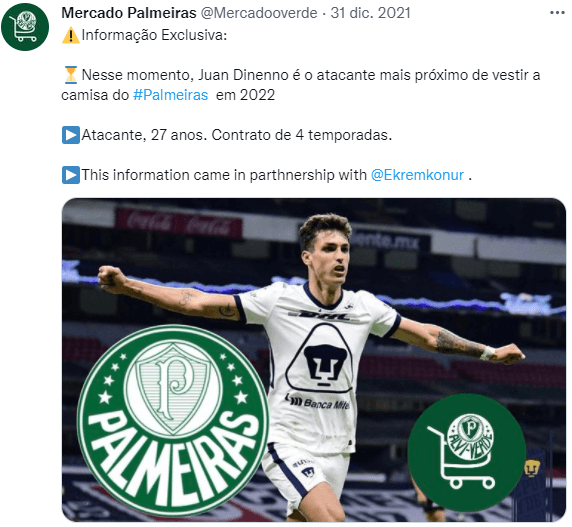 No es la primera vez que Palmeiras suena como posible club para Dinenno, ya que en febrero del 2021 surgieron versiones que lo ponían en la órbita del Verdao, así como del Sao Paulo. De concretarse esta ocasión sería un duro golpe para los Pumas porque los del Pedregal solamente dispondrían como delanteros de Washington Corozo, Rogerio, Diogo y Emanuel Montejano pensando en el debut contra Toluca el domingo 9 de enero.