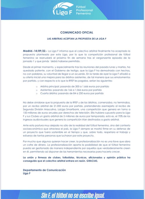 En un comunicado publicado en la noche del miércoles, la Liga F, nombre del campeonato femenil, informó que "el colectivo arbitral finalmente ha aceptado la propuesta planteada por esta Liga".